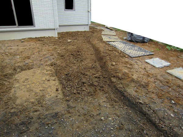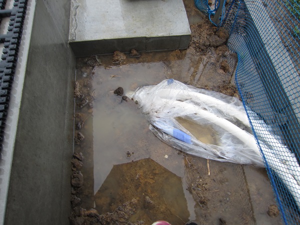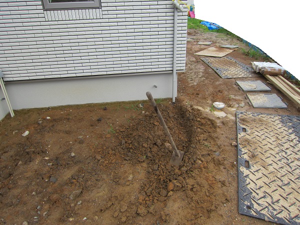 内装仕上げ 2015/06/28 引渡し前に水没寸前。これで引き渡されても住めません。誰のせいなの。★★一条工務店i-smartの上棟71~72日目★★ さんぺいです。今日は引越し屋さんとの打ち合わせでした。前回、旧邸から仮住まいへの引越しはパンダさんにお世話になったので、またパンダさんにお見積もりをお願いしました。前回と同様、テキパキと見積もりをしてくれました。前回来てくれた作業の方々が、すごくいい方でしたので、今回も来て頂けるとイイなと思っています。ランキングに参加しています。ポチッとしていただけるとありがたいです。↓ ↓ ↓にほんブログ村引渡し前に水没寸前。これで引き渡されても住めません。誰のせいなの。★★一条工務店i-smartの上棟71~72日目★★金曜日は現場稼動81日目。着工日から110日目、上棟71日目 内部養生撤去、クリーニング。土曜日は現場稼動82日目。着工日から111日目、上棟72日目 外部物干し金物取付です。今日は朝からクリーニングです。引渡し前に養生を外して、掃除をしていたのですが・・・まだ畳は張られていませんし、エアコンや床暖房の液注入もまだです。水道工事もまだ内部の残工事があります。太陽光も一部未施工ですので、設定も残っています。ですので、まだまだ業者さんたちが出入りします。なのに、今日は養生撤去、クリーニングでした。てっきりクリーニングは一番最後だと思っていたのに。順番おかしくない?まぁいいですが。そしてクリーニング後に夕方から雨が強くなってきました。しかし、まだ雨水の樋から先の工事をしていません。そしたらみるみるうちに、新居の周りがプール状態に。 東側です。完全に新居周囲が水没しています。 結構な感じで溜まりました。 北側です。こっちはもっと水深が深いです。北側には猫の避難小屋と犬小屋もありますが・・・ 犬小屋も水没しそう。こちらのほうが深刻です。 西側です。エコキュートがもうちょっとすると水没します。なぜこんなことになっているのかというと・・・ さんぺい邸の全体図です。上が北です。GLよりも現況の北側は、基礎工事前の先行外構で漉き取りが行われて以降、だいぶ低くなっています。接道している南側の道路が低く、雨水は現況南側に流れます。しかし、先行外構が悪いのか、基礎の漉き取りが悪いのか、GLの設定の仕方が悪いのかよくわかりませんが、まだ雨水の経路を作っていない現状で雨が降ると、樋からの水が本来は南に流れるところ、北側の排水の流末が無いほう側に流れ込み、溜まってしまっているということです。設計さんが悪いのか、先行外構業者が悪いのか、基礎屋さんがわるいのか、さんぺいが悪いのか・・・雨水の経路工事は外構で行う予定ですので、引渡し後もしばらくはこれが続く可能性があります。雨が降っては家に入れないという状況になりそう。引渡しをして、一条さんがバイバイ~ってしてから、さんぺいはそんなんで住めるの!?。 あと西側に水没している場所に、エアコンの先行配管と思われるパイプが。直接土に刺さっています。基礎工事の際からずっと気になっていたのですが、基礎の下を直接パイプが土の中を通っています。こんなんでいいのでしょうか。なぜ壁を抜かない? これが基礎工事の際の同じ場所の写真です。状況はなにも変わっていません。翌朝確認してみると・・・水は引いていました。 ただ、こんな配管が完全に水没していたとなると、基礎内部への水の浸入が心配ですし、機械への影響が心配です。ビニールが巻いてありましたが、封もしていないですし、かぶっているだけです。 こんなのが完全に水没してていいものでしょうか。とりあえずさんぺいができることは・・・・ 樋から北側に流れる水を、本来の南側に流れるように仮の土側溝をつくること。南側に掘り進めていると・・・板金屋さんが来ました。 板金屋さん2人で、5分ほどで、外部の物干し金物を設置していかれました。そしてさんぺいの工事も・・・ とりあえず完成です。これで北側への水没までの状況は避けられると思われます。みなさんの参考になるブログはこちらから↓ ↓ ↓にほんブログ村 [2回] スポンサードリンク