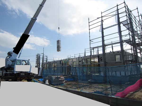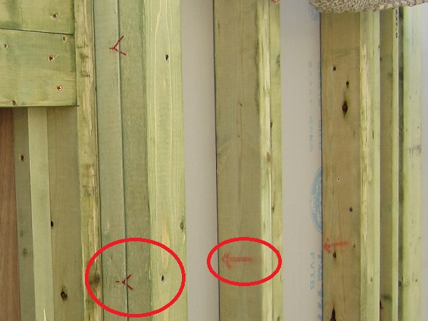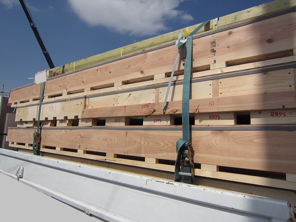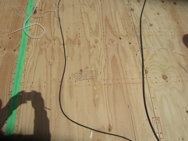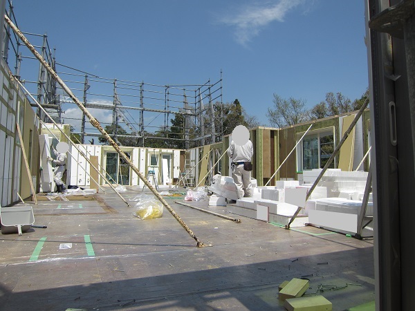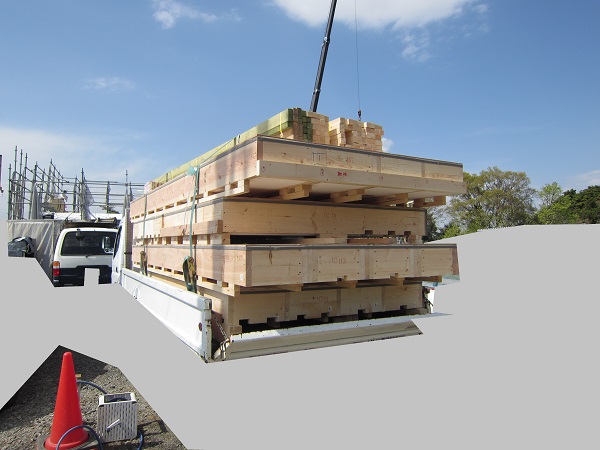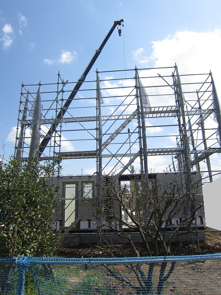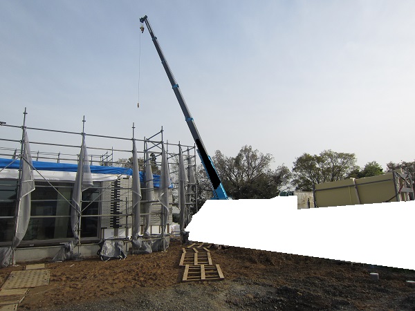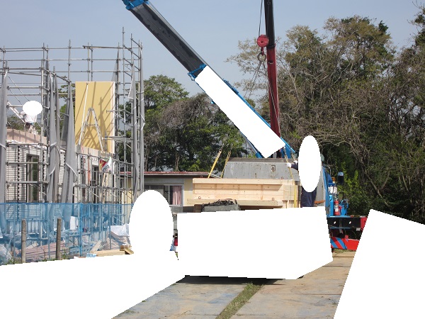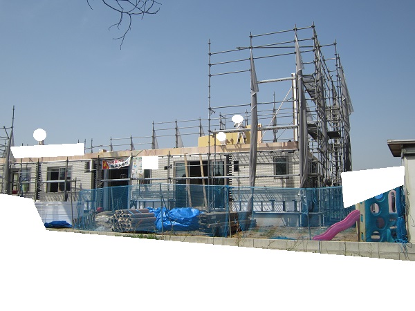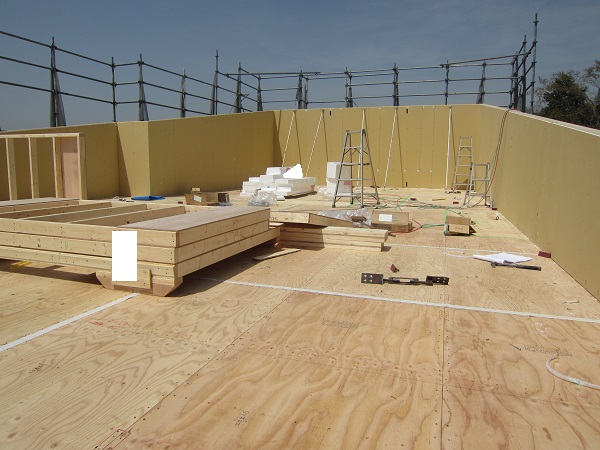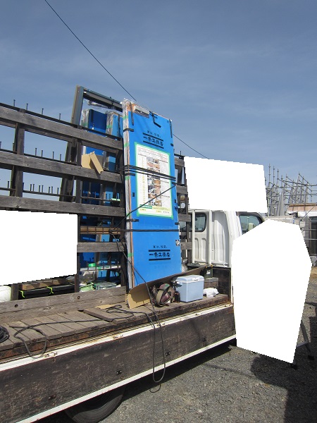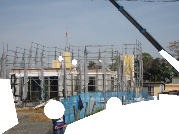 上棟 2015/04/19 上棟その2 上棟で使用する部材はすべて段取りを計算されたものばかり★★一条工務店i-smartの上棟1日目PM★★ さんぺいです。現場で作業をされる方用のお菓子を最近買い込み、家にストックのお菓子が増えました。必然的に食べてしまい、最近ちょっと太ってきたさんぺいです。みなさんの参考になるブログはこちらから↓ ↓ ↓にほんブログ村上棟その2 上棟で使用する部材はすべて段取りを計算したものばかり★★一条工務店i-smartの上棟1日目PM★★さて金曜日は現場稼動23日目。着手日から40日目。上棟当日の午後のつづきです。朝はいつ降ってくるかわからないような曇り空でしたが、10時の休憩をとったら一気に晴れてきました。 30分ほどでこの変わり様です。 上棟監督さんいわく、熱がこもるので暑いぐらいになってきます。10時の休憩までに、外壁ぐるっと終わったので、中の壁になります。50枚以上あるということで、運送屋さんが参ったと言っていました。(笑)そのあとの天井も30枚ということで、通常よくあるパターンの倍とのこと。平屋のコスト高はこの辺にもあるようですね。中の壁はGIFアニメ(動きますよ)で・・・・ さっきよりはちょっと高く上がっています。 ちょっと風にあおられています。 何枚も何枚も飛びます。 ほどなくして設備が搬入されてきました。クローゼットやブックシェルフなどです。ユニットバスだけは午前中でした。 天井パネルの待機の運転士さんが待ちきれずに現場へ。 天井は断熱材セット済みなので厚いですね。 一通り、中の壁が飛んだあと・・・・クローゼットが飛びます。ブックシェルフも飛びます。一通り設備が飛んだあと、上棟スタッフが登って、木材を打ち始めます。ここで、転落防止用のネットをつけます。私はタイミングを逃しましたが、設備が飛び終わって、ネットを張る僅かの間に監督さんに頼んで上から撮ると、リアル間取図が見ることができます。 この写真を見て、家内が・・・ またまた出ました。たけし城の悪魔の館の見た感じだと・・・。ここで15時の休憩時間です。補充のコーヒーやお菓子を持っていきつつ、作業がとまったので、監督さんにお願いして中を見せてもらいました。 保安ボックスにヘルメットが常備されています。中に入ります。 明るい!天井がないので、明るい家です。浸み込ませた防蟻処理の柱がいっぱいです。防蟻処理は一階部分までですので、平屋ですとほとんどです。これも平屋のコスト高ですね。 4コマパノラマで明るいLDKです。というか天井がないので。 3コマの窓も大きいですね。赤丸の部分の床パネルはねじを打っていませんでした。 監督さんに教えてもらったのですが、このパネルは一通り調整するまではねじを打たず、中に雨が浸入した場合、基礎へ掃きだすための穴だそうです。最終的には閉めます。 床板の合板はFフォスターの低ホルムアルデヒドのJASの構造用合板が使用されていました。フィリピン製でもJAS認定品を使っているのですね。認定工法だと使わないといけないのでしょうが。 壁下地の指定箇所は既に施工されている状態でした。低ホルムアルデヒドの板かどうかは不明ですが。 監督から教えてもらったのですが、「Y」のところは釘を斜め打ち、←のところは脳天打ちだそうです。そして赤が90mmの釘、緑が何ミリだったか短い釘だそうです。赤が多かったです。緑は床板などにあるようです。 お風呂です。 休憩後は天井パネルです。 平屋は天井多いですね。逆に外壁は少ないのでしょうが。天井を貼ったあと、また監督さんにお願いして中へ。 ほんとこれを1日でできてしまうのは、2×4、2×6だからできることですね。みなさんの参考になるブログはこちらから↓ ↓ ↓にほんブログ村 [1回] スポンサードリンク