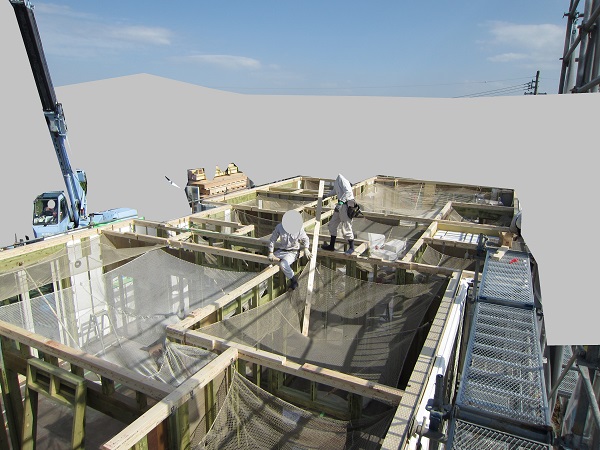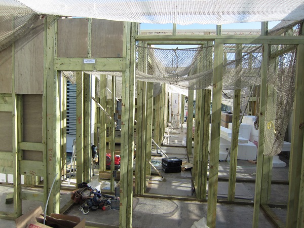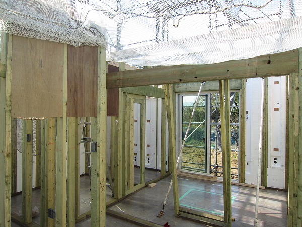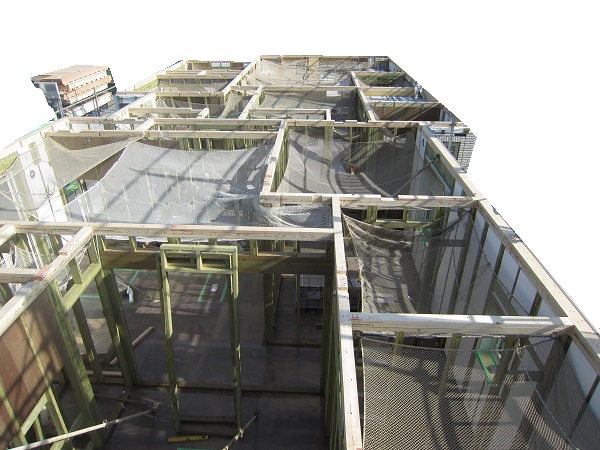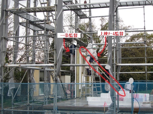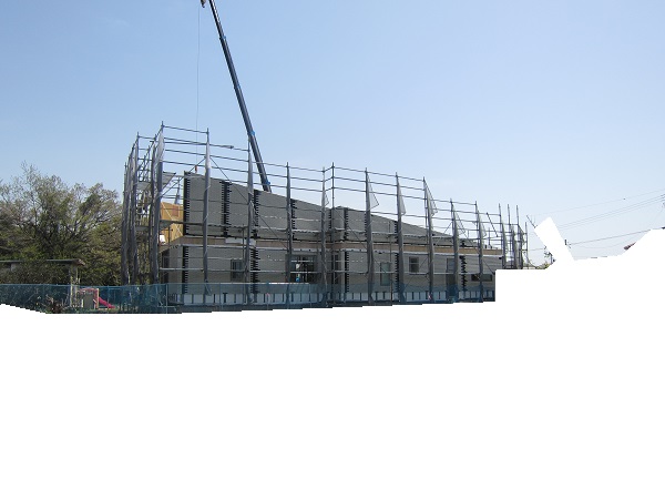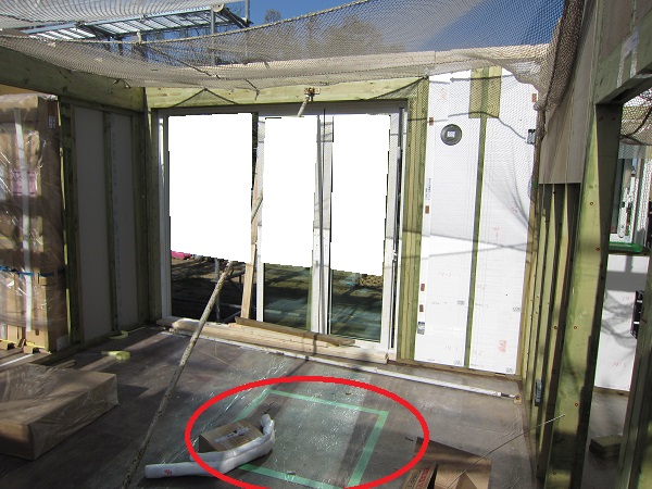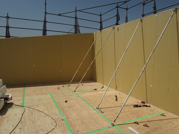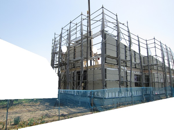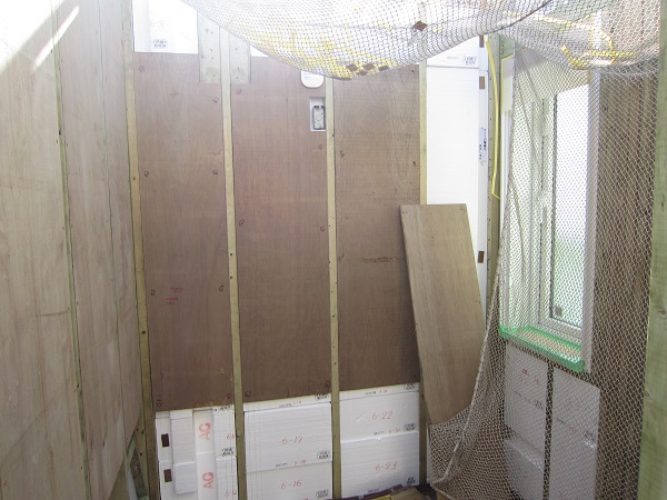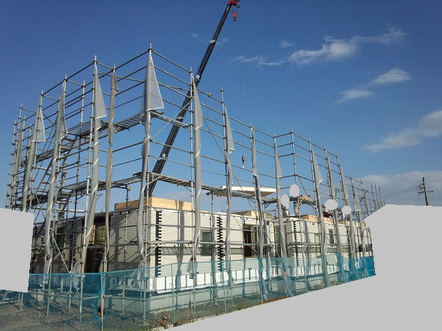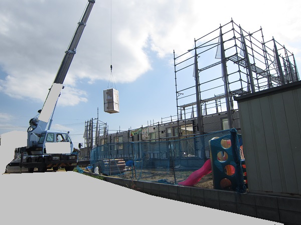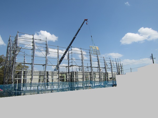 上棟 2015/04/19 上棟その2 上棟で使用する部材はすべて段取りを計算されたものばかり★★一条工務店i-smartの上棟1日目PM★★ さんぺいです。現場で作業をされる方用のお菓子を最近買い込み、家にストックのお菓子が増えました。必然的に食べてしまい、最近ちょっと太ってきたさんぺいです。みなさんの参考になるブログはこちらから↓ ↓ ↓にほんブログ村上棟その2 上棟で使用する部材はすべて段取りを計算したものばかり★★一条工務店i-smartの上棟1日目PM★★さて金曜日は現場稼動23日目。着手日から40日目。上棟当日の午後のつづきです。朝はいつ降ってくるかわからないような曇り空でしたが、10時の休憩をとったら一気に晴れてきました。 30分ほどでこの変わり様です。 上棟監督さんいわく、熱がこもるので暑いぐらいになってきます。10時の休憩までに、外壁ぐるっと終わったので、中の壁になります。50枚以上あるということで、運送屋さんが参ったと言っていました。(笑)そのあとの天井も30枚ということで、通常よくあるパターンの倍とのこと。平屋のコスト高はこの辺にもあるようですね。中の壁はGIFアニメ(動きますよ)で・・・・ さっきよりはちょっと高く上がっています。 ちょっと風にあおられています。 何枚も何枚も飛びます。 ほどなくして設備が搬入されてきました。クローゼットやブックシェルフなどです。ユニットバスだけは午前中でした。 天井パネルの待機の運転士さんが待ちきれずに現場へ。 天井は断熱材セット済みなので厚いですね。 一通り、中の壁が飛んだあと・・・・クローゼットが飛びます。ブックシェルフも飛びます。一通り設備が飛んだあと、上棟スタッフが登って、木材を打ち始めます。ここで、転落防止用のネットをつけます。私はタイミングを逃しましたが、設備が飛び終わって、ネットを張る僅かの間に監督さんに頼んで上から撮ると、リアル間取図が見ることができます。 この写真を見て、家内が・・・ またまた出ました。たけし城の悪魔の館の見た感じだと・・・。ここで15時の休憩時間です。補充のコーヒーやお菓子を持っていきつつ、作業がとまったので、監督さんにお願いして中を見せてもらいました。 保安ボックスにヘルメットが常備されています。中に入ります。 明るい!天井がないので、明るい家です。浸み込ませた防蟻処理の柱がいっぱいです。防蟻処理は一階部分までですので、平屋ですとほとんどです。これも平屋のコスト高ですね。 4コマパノラマで明るいLDKです。というか天井がないので。 3コマの窓も大きいですね。赤丸の部分の床パネルはねじを打っていませんでした。 監督さんに教えてもらったのですが、このパネルは一通り調整するまではねじを打たず、中に雨が浸入した場合、基礎へ掃きだすための穴だそうです。最終的には閉めます。 床板の合板はFフォスターの低ホルムアルデヒドのJASの構造用合板が使用されていました。フィリピン製でもJAS認定品を使っているのですね。認定工法だと使わないといけないのでしょうが。 壁下地の指定箇所は既に施工されている状態でした。低ホルムアルデヒドの板かどうかは不明ですが。 監督から教えてもらったのですが、「Y」のところは釘を斜め打ち、←のところは脳天打ちだそうです。そして赤が90mmの釘、緑が何ミリだったか短い釘だそうです。赤が多かったです。緑は床板などにあるようです。 お風呂です。 休憩後は天井パネルです。 平屋は天井多いですね。逆に外壁は少ないのでしょうが。天井を貼ったあと、また監督さんにお願いして中へ。 ほんとこれを1日でできてしまうのは、2×4、2×6だからできることですね。みなさんの参考になるブログはこちらから↓ ↓ ↓にほんブログ村 [1回] スポンサードリンク