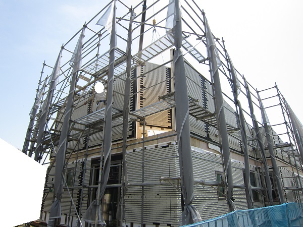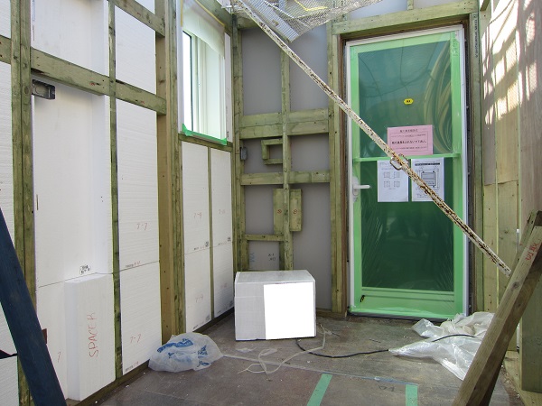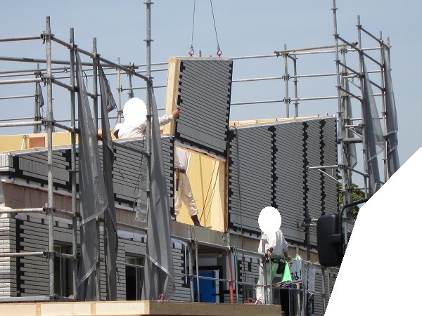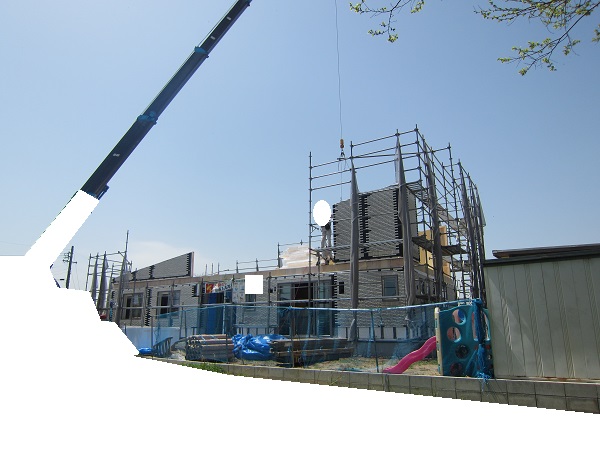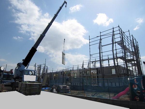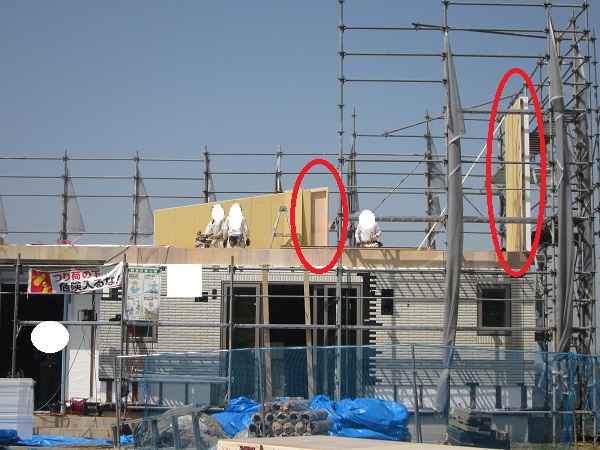 上棟 2015/04/21 上棟その3 高気密i-smartの壁パネルの隙間をなくす方法を教えてもらった ★★一条工務店i-smartの上棟2日目AM★★ さんぺいです。現場が目まぐるしく変化しており、どうにもこうにもついていけない感じのさんぺいです。みなさんの参考になるブログはこちらから↓ ↓ ↓にほんブログ村上棟その3 高気密i-smartの壁パネルの隙間をなくす方法を教えてもらった ★★一条工務店i-smartの上棟2日目AM★★さて土曜日は現場稼動24日目。着手日から41日目。上棟2日目の午前です。 昨日で1階の天井まで施工されていますので、2日目は2階相当部分と屋根です。監督さん曰く、昨日と同じぐらい時間はかかるとのこと。素人的に、1日目の平屋の1階部分をつくるより、2日目の平屋の屋根だけつくるということには手間がかからないように思いましたが、あとで作業手間としてはそこまで変わらないようです。 まず、昨日と同じく外壁からです。まず北側の一番高いところのパネルが1枚だけ施工されました。2階並の外壁です。でもこの1枚だけで次の作業へ。どうやらパネルの積み込む順番で、欠落していた模様。でもあわてない。しばらくすると上から監督さんが「さんぺいさん、玄関が来ましたよ~」と教えてくれました♪ 地元の建具屋さんが納品と設置のようです。 三協アルミ製の玄関。玄関ドアはオリジナルでは作らないんですね。(それでいいですが) 角のパネルから設置していくのがセオリーのようです。どんどん設置されていきます。 クレーンに掛けるのは運送屋さんの仕事です。順番を確認しながら壁パネルを掛けていきます。運転手なのに何でもするんですね。 一条の監督さんが指示を出しています。安心です。 建具屋さんが、玄関の枠を取り付けしています。 右の赤丸のパネルはずっと独立したままでした。左の赤丸部分を見ると、ボードを貼っている途中のようです。中は空洞のようですね。平屋の2階相当部分はEPSやグラスウールは無いのですね。色も防蟻処理の色ではありません。 順番待ちの壁パネルが地面に置かれていました。大きいですね。 いよいよ玄関の取り付けです。 西側です。すごい角度。家内曰く、「ショートケーキみたい」 漸く北側が設置されていきます。 北側がやっぱり高いですね。2階と同じです。 監督がタイルの通りを確認していました。 正面からみると、要塞みたいです。 わずかに波打っているような・・・。まだ仮止めでしょうから、こんなもんですかね。 最後の外壁が入ります。ちょっと入れにくそうです。 最後は大ハンマーで叩いていました(泣)ここでお昼休憩です。差し入れの補充を持っていきがてら、監督さんへカメラを。 うなぎの寝床の1.5寸の家だけあって、屋根裏が広い。部屋にしたい。固定資産税がかからなければ(笑) 北側の壁、めちゃくちゃ高いです。 作ろうと思えば、高さ1400mm確保でも、40~50畳は小屋裏が可能ですが、予算都合もあるので、小屋裏は8畳です。ほんとはロフトにしたかった。監督さんが小屋裏の扉を開けてくれました。 赤い部分にパッキンがあって、気密を確保しているとのこと。ですので屋根裏は気密を取っていないとのこと。 小屋裏もJASの構造用合板でした。 ボードに「仮」と書いてあるところはボードが外せるようです。はずして、ビス止めをするために仮になっているとのこと。穴のあいているところからもビスがさせます。外壁パネルについて、監督さんが教えてくれました。よく壁の継ぎ目の隙間を気にされるのですが・・・・ 赤いところで気密性をとっているわけではありません。 外側からもビスを打つことで、面で気密性をとっているとのこと。なるほど。だから2×4や2×6は気密性がいいのですかね。つづく・・・みなさんの参考になるブログはこちらから↓ ↓ ↓にほんブログ村 [2回] スポンサードリンク
