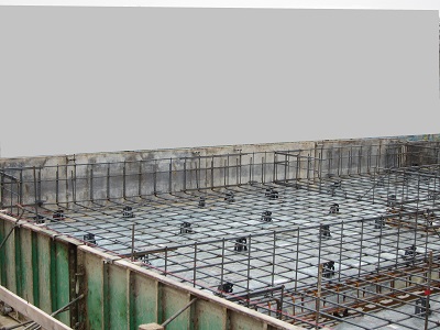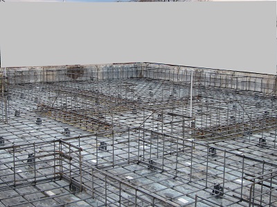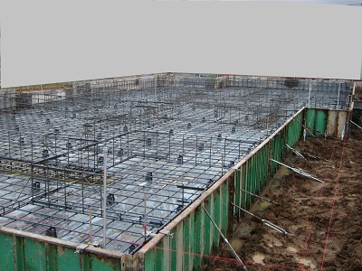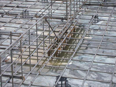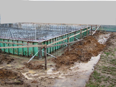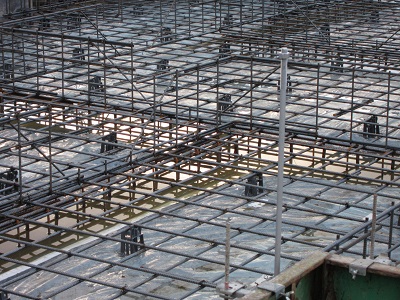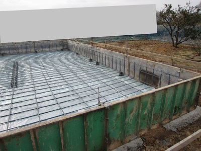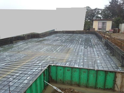 水をポンプでかきだして、鉄筋組み。スペーサーも入れられて、かぶりを確保しました。
