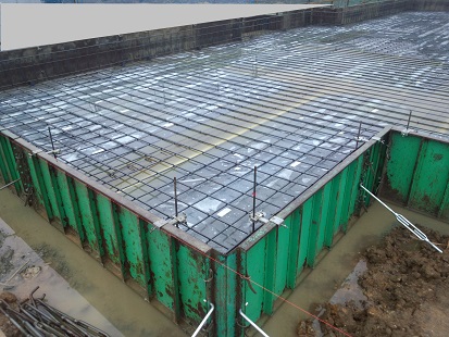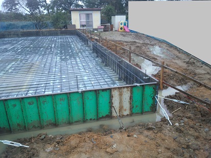 昨夜の大雨で、防湿シート内を貼られた型枠内はプール状態でした。