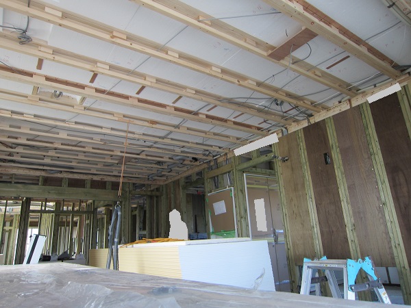 工事中のさんぺい邸の天井です。断熱材の下に梁が何本も通っています。この部分に石膏ボードと壁紙をはった上から取り付けることになります。DIYする場合はこの状態で写真をとっておくべきでしょうか。