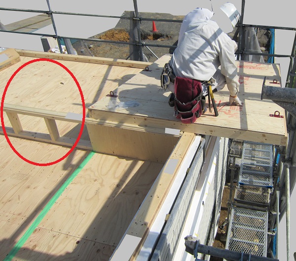 上棟完了後~大工工事 2015/04/28 コーキング12本使用。なかなか出ないC値。6時間格闘の監督さんありがとう。★★一条工務店i-smartの上棟9日目★★ さんぺいです。省エネ住宅エコポイントの審査完了のはがきが送られてきました。30万ポイント。即時交換です。完了報告を忘れないようにしなきゃ。ポチッとしてくれるとやる気がでます。↓ ↓ ↓にほんブログ村コーキング12本使用。なかなか出ないC値。6時間格闘の監督さんありがとう。★★一条工務店i-smartの上棟9日目★★土曜日は現場稼動31日目。着手日から48日目。上棟9日目ですさて、土曜日は気密測定でした。午前中はサイディング屋さんが工事をしていました。14:30過ぎに監督さんが到着。準備を開始しだしました。監督さん一人で、棟梁は立ち会わないようです。さんぺいは居てもたってもいられず、事前準備も手伝う気マンマン。絶対C値0.6は切りたいと考えていました。 子供部屋にバズーカ砲を設置。空けた窓にフィルムを全体的に養生テープで貼り付けていきます。 手馴れたもんです。 気密測定器は各工事課に1~2台しかないので、機械の段取り都合もあるみたいですね。さてさて、準備完了。と、その前に監督さんが、まだ化粧モルタルやタイルの貼っていない玄関周りの隙間にテープ貼りをしっかりとしていました。あと気になるところにもコーキングを。そこでさんぺいが・・・さんぺい「天井裏を見たいのですが。」監督さん「いいですよ。私も後で行くつもりでした。」で、天井裏へ。平屋は「床と外気」、「天井と外気」の接する部分が多いので、気密測定の前にどうしても見ておきたかったのです。 天井裏は軒下の板金がしていないので、太陽が見えていて明るかったです。地鎮祭のお守りを納められてくれてありました。 太陽光の配線も、電気屋さんが気密をとっている天井板をあけて施工した後に、コーキングをしてくれてありました。 でも見つけました。電気屋さんが使っていない穴を発見。監督にお願いをしてふさぎました。よかった。あと5箇所ほど、天井板の節の穴などから光が漏れている箇所があり、コーキングをしてもらいました。この作業だけで30分ほどかかりました。これから気密測定をされる方は、早めに行って監督さんと事前に天井裏に上っておくことをお勧めします。さてさて、それではスイッチ投入です。1回目スイッチオン!!!!ウィィン---- あれ、ファンは回っていますが、ぜんぜん気圧差がでません。50Pa以上の差が出ないと自動測定できませんとのエラーメッセージ。どっかに大きく穴が開いているのでしょうか。 さんぺいが・・・さんぺい「サッシの建てつけに歪みがあるようですが、これですか?」監督さん「いや、それはそんなもんです。」「あっ、気密測定器の配管をまちがっていました。ごめんさい。」よかった。気を取り直して・・・・2回目スイッチオン!!!ウィィン----ドスン!!!!!!さんぺい「監督さん、床板が浮いてきましたよーーーーー!」監督さん「棟梁がまだ仮の床下点検口を塞いでくれていなかったんですね。」すごい威力ですね。この機械。こんな床板が浮いてきた決定的シャッターチャンスを逃してしまいました。 とりあえず監督さんが釘で固定しました。再度気を取り直して・・・・3回目スイッチオン!!!ウィィン---- 監督さん「5段階で測定します。」キュルルルルーーーー監督さん「そしてC値算出用の床面積をいれてっと・・・」 ピッピッピッ・・・監督さん「・・・0.9ですね。」さんぺい「えっ・・・・・・・」監督さん「最初はこんなもんですよ。隙間を探していきましょう。」そして何回もまわして風を感じて、コーキングをしていきます。特に風を感じたのは・・・ 電気屋さんがコーキングをしてくれてはありましたが、配線が束になっているとどうしても隙間があります。再度コーキングをしました。10~20箇所ぐらいはコーキングをしました。そして、10回目ぐらい・・・監督さん「・・・・0.8まで下がりました。でも0.7が合格ラインです。」さんぺい「そうですかぁ・・・・。0.6以下を出したかったのに」監督さん「全国平均が0.6なんですよ。なんとか出してみせます。今から天井裏に上って、すべての目地にコーキングをします。」さんぺい「既に日が暮れ始めてきたので、天井裏は暗いですが・・・」監督さんが、スマホの電気片手にコーキングを始めました。 これは明るいときにとった天井裏を中央の位置からとったものです。前後倍の面積があります。ということで、さんぺいがLEDライトで照らしながら、すべての目地にコーキングをしていきました。すごい数の目地でした。ほんと大変でした。あとかなり狭いところは狭い。 写真は上棟中のときに監督さんに撮ってもらったものですが、この赤丸軒先の部分なんかにも監督さんは潜って・・・ コーキングで埋めてくれました。監督さん本当にありがとう。超熱心な監督さん。監督さんも私も全身コーキングまみれになりました。
