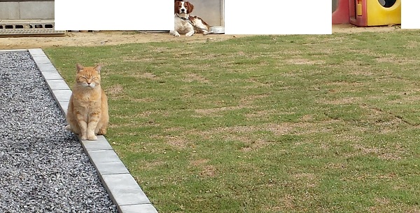 さんぺいが養生中の芝に毎朝セッセと水をやったり、小石を拾ったりしているのを知っているせいか、お猫様は大好きなはずの芝生にあまりのりません。むしろ避けて地先ブロックの上を歩きます。日なたぼっこもここです。