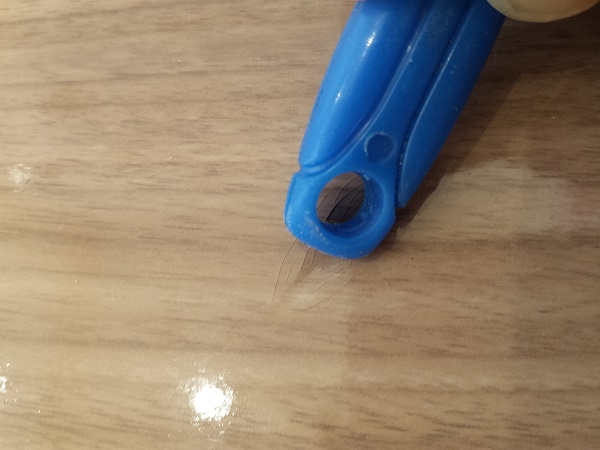 引いてみると・・・。ホットナイフの先の部分が傷の部分です。