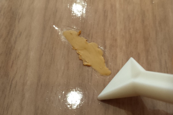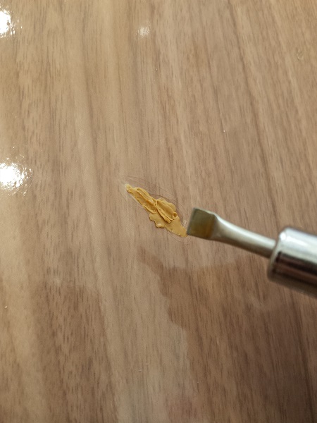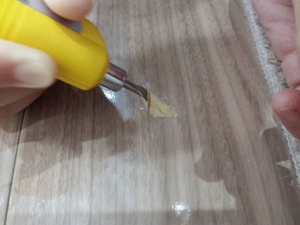 まず傷を歯ブラシのお尻のような丸い角でこすり、傷の出っ張りをなくします。これをしないと、仕上がりが盛り上がったようになってしまいます。