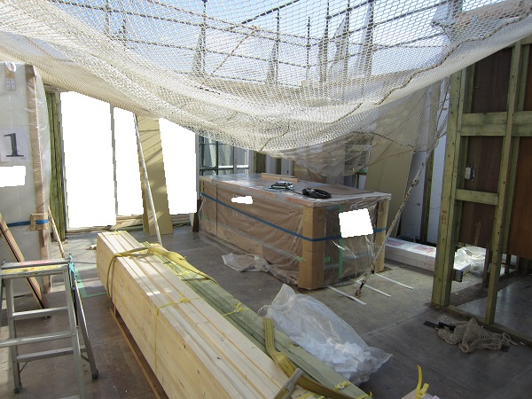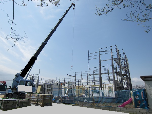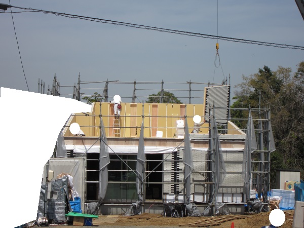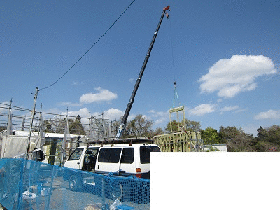 上棟 2015/04/19 上棟その2 上棟で使用する部材はすべて段取りを計算されたものばかり★★一条工務店i-smartの上棟1日目PM★★ さんぺいです。現場で作業をされる方用のお菓子を最近買い込み、家にストックのお菓子が増えました。必然的に食べてしまい、最近ちょっと太ってきたさんぺいです。みなさんの参考になるブログはこちらから↓ ↓ ↓にほんブログ村上棟その2 上棟で使用する部材はすべて段取りを計算したものばかり★★一条工務店i-smartの上棟1日目PM★★さて金曜日は現場稼動23日目。着手日から40日目。上棟当日の午後のつづきです。朝はいつ降ってくるかわからないような曇り空でしたが、10時の休憩をとったら一気に晴れてきました。 30分ほどでこの変わり様です。 上棟監督さんいわく、熱がこもるので暑いぐらいになってきます。10時の休憩までに、外壁ぐるっと終わったので、中の壁になります。50枚以上あるということで、運送屋さんが参ったと言っていました。(笑)そのあとの天井も30枚ということで、通常よくあるパターンの倍とのこと。平屋のコスト高はこの辺にもあるようですね。中の壁はGIFアニメ(動きますよ)で・・・・ さっきよりはちょっと高く上がっています。 ちょっと風にあおられています。 何枚も何枚も飛びます。 ほどなくして設備が搬入されてきました。クローゼットやブックシェルフなどです。ユニットバスだけは午前中でした。 天井パネルの待機の運転士さんが待ちきれずに現場へ。 天井は断熱材セット済みなので厚いですね。 一通り、中の壁が飛んだあと・・・・クローゼットが飛びます。ブックシェルフも飛びます。一通り設備が飛んだあと、上棟スタッフが登って、木材を打ち始めます。ここで、転落防止用のネットをつけます。私はタイミングを逃しましたが、設備が飛び終わって、ネットを張る僅かの間に監督さんに頼んで上から撮ると、リアル間取図が見ることができます。 この写真を見て、家内が・・・ またまた出ました。たけし城の悪魔の館の見た感じだと・・・。ここで15時の休憩時間です。補充のコーヒーやお菓子を持っていきつつ、作業がとまったので、監督さんにお願いして中を見せてもらいました。 保安ボックスにヘルメットが常備されています。中に入ります。 明るい!天井がないので、明るい家です。浸み込ませた防蟻処理の柱がいっぱいです。防蟻処理は一階部分までですので、平屋ですとほとんどです。これも平屋のコスト高ですね。 4コマパノラマで明るいLDKです。というか天井がないので。 3コマの窓も大きいですね。赤丸の部分の床パネルはねじを打っていませんでした。 監督さんに教えてもらったのですが、このパネルは一通り調整するまではねじを打たず、中に雨が浸入した場合、基礎へ掃きだすための穴だそうです。最終的には閉めます。 床板の合板はFフォスターの低ホルムアルデヒドのJASの構造用合板が使用されていました。フィリピン製でもJAS認定品を使っているのですね。認定工法だと使わないといけないのでしょうが。 壁下地の指定箇所は既に施工されている状態でした。低ホルムアルデヒドの板かどうかは不明ですが。 監督から教えてもらったのですが、「Y」のところは釘を斜め打ち、←のところは脳天打ちだそうです。そして赤が90mmの釘、緑が何ミリだったか短い釘だそうです。赤が多かったです。緑は床板などにあるようです。 お風呂です。 休憩後は天井パネルです。 平屋は天井多いですね。逆に外壁は少ないのでしょうが。天井を貼ったあと、また監督さんにお願いして中へ。 ほんとこれを1日でできてしまうのは、2×4、2×6だからできることですね。みなさんの参考になるブログはこちらから↓ ↓ ↓にほんブログ村 [1回] スポンサードリンク