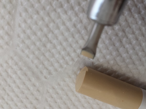 まず傷を歯ブラシのお尻のような丸い角でこすり、傷の出っ張りをなくします。これをしないと、仕上がりが盛り上がったようになってしまいます。