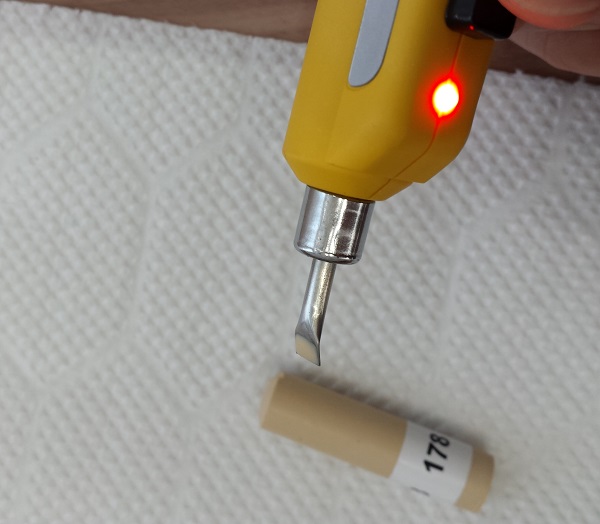 スイッチをオンにして、白いボタンを押すと、先が熱くなります。(ヤケドなどに注意)